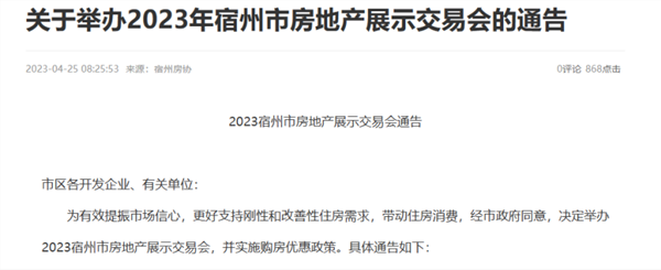 4月25日,宿州房协发布公告称,将于4月29日至5月3日,举办2023宿州市房地产展示交易会,并实施购房优惠政策。