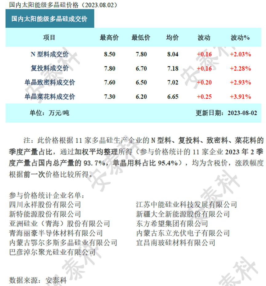 7月底硅片龙头厂家更新报价,M10尺寸新的报价上调到每片2.93-2.95元人民币之间,其余硅片厂家也随后陆续上调价格,本周主流成交价格出现上行,P型硅片中M10与G12尺寸落在每片2.95元与每片3.92元人民币左右,同比上周涨幅约4-6%不等。N型硅片部分,本周主流成交价格也对应上升到每片3.05元人民币。