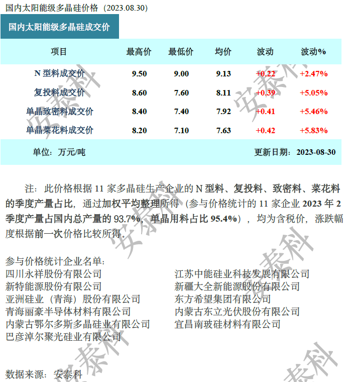 针对仍在执行的前期订单,部分订单存在调价机制,或涉及价格更改和调涨;但是也有部分执行订单因硅料厂家发货排期推迟和频次不理想等原因导致延迟和未执行完毕,价格或可依照之前水平执行。由于七八月硅料环节整体产量低于预期范围,新产能投产和爬坡进度也不甚理想,以及厂家调整产出比例等综合原因,硅料环节目前供应整体趋紧的局面未有改善,针对九月新订单的谈判和签单积极性持续高涨。