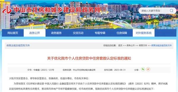 8月31日,广东中山市住建局发布《关于优化我市个人住房贷款中住房套数认定标准的通知》。