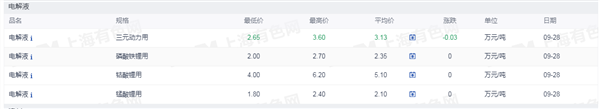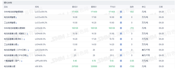 网络整理 2025-09-01 12:01证券之星新能源车行业周报:据上海有色网,截止9月28日,电池级碳酸锂16-17.8万元/吨,均价16.9万元/吨,环比上一工作日持平;工业级碳酸锂15-16.2万元/吨,均价15.6万元/吨,环比上一工作日持平。今日已是国庆小长假前的前夕,下游多数厂家已于前期完成节前小幅补库,当前市场总体成交依旧偏淡。