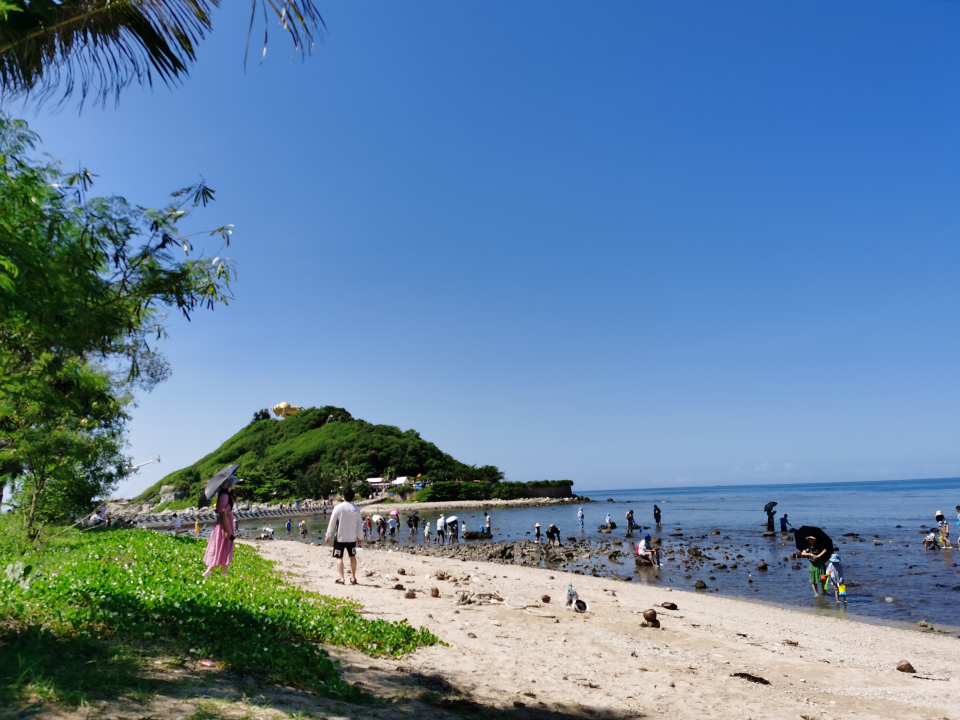 游客中心是海底世界的天幕银屏,美不胜收,还有各种卖纪念品和游玩设备的店铺,基金君应小朋友要求买了套挖沙设备。然后买了观光车的票,前往牛王岛。一路上海风拂面,滨海景观大道可以看到游客骑着小电驴,还有心形观海亭等各种网红打卡景点。