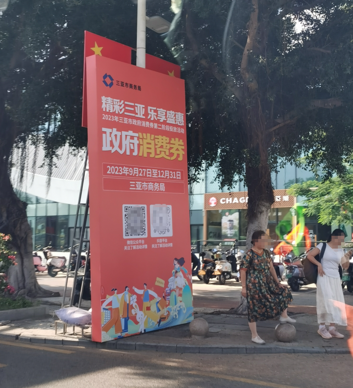 第二天一大早我们继续出发,坐车去鹿回头风景区。在路上还看到了三亚市商务局发的政府消费券,据了解,此次发放政府消费券逾7000万元,涵盖新能源汽车、离岛免税、商超零售、餐饮、智能手机等,只要手机定位在三亚市的用户都可以使用。