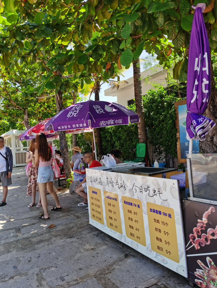 我们大约玩了几个小时打算回程,沙滩旁边是冲淡区,还有很多杂货铺,可以购买替换的衣物、游泳设备、海南纪念品等,价格也不贵。但晚上景区附近有点堵车,据说有不少打算夜游鹿回头的游客正准备上山。