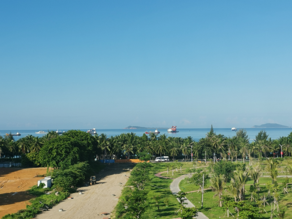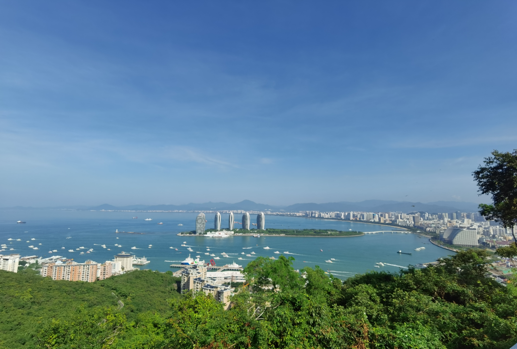 我们坐车到山顶,看到了千帆竞发的壮观景象,还有凤凰岛的建筑物、三亚湾、天涯海角、东岛和西岛等。