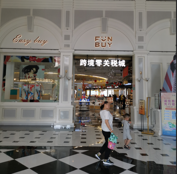等玩累了可以继续坐观光车回程,在出口附近还有海南自贸港跨境零关税城,在里面可以看到各国的产品,服务周到,自动结算也非常方便。