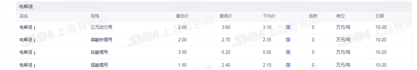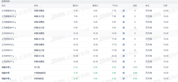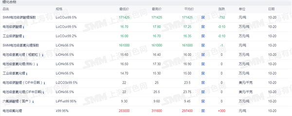 网络整理 2025-09-01 12:58证券之星新能源车行业周报:据上海有色网,截止10月20日,电池级碳酸锂16.70- 17.80万元/吨,均价17.25万元/吨,环比上一工作日下滑0.1万元/吨;工业级碳酸锂16.0-16.7万元/吨,均价16.35万元/吨,环比上一工作日下滑0.1万元/吨。近期锂盐价格走势逐渐趋弱,整体看,当前产业链上下游的僵持行情仍在持续,下游实际需求低迷,对高价锂盐依旧持一种不备、不采的态度,市场整体零单成交较为清淡。而部分厂商在这种情况下,报价下行,市场重心逐步下行,锂盐价格转跌。