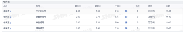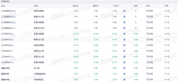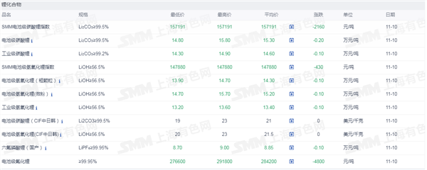 网络整理 2025-09-01 13:28证券之星新能源车行业周报:据上海有色网,截止11月10日,电池级碳酸锂14.8-15.8万元/吨,均价15.3万元/吨,环比上一工作日下滑0.2万元/吨;工业级碳酸锂14.3-14.9万元/吨,均价14.6万元/吨,环比上一工作日下滑0.1万元/吨。上游锂盐企业更多以长单出售为主,挺价心态依旧,但个别锂盐企业随行就市小幅下调出售价格,下游正极材料企业出于降本增效策略,其散单拿货情绪也依旧低迷,近期碳酸锂现货市场成交价格仍呈现下行趋势。