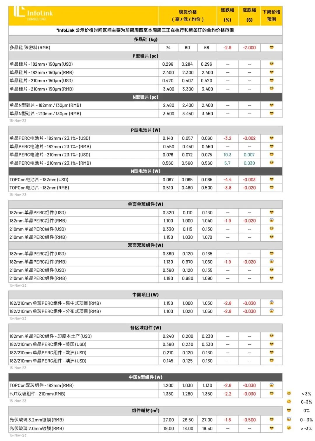 11月中国出口执行价格暂时稳定约每瓦0.12-0.135元美金(FOB),不排除12月整体价格将来到每瓦0.12元美金。亚太地区执行价格约0.12-0.13元美金。印度本地组件平均价格约每瓦0.2-0.24元美金。欧洲近期现货价格约在每瓦0.11-0.135欧元,价格暂时趋稳。