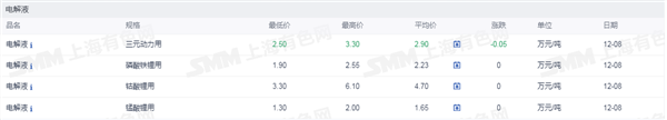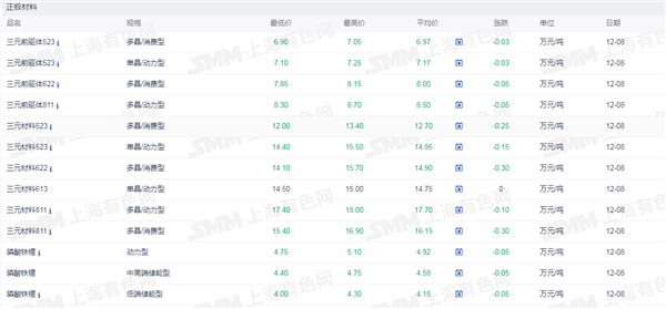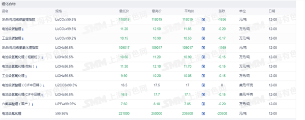 网络整理 2025-09-01 14:44证券之星新能源车行业周报:据上海有色网,截止12月8日,电池级碳酸锂11.2-12.5万元/吨,均价11.85万元/吨,环比上一工作日下滑0.2万元/吨;工业级碳酸锂10.15-10.9万元/吨,均价10.53万元/吨,环比上一工作日下滑0.17万元/吨。12月8日市场中锂盐企业的出货情绪抬升,个别锂盐企业和正极材料以11.2万元/吨价格成交较多的电池级碳酸锂,而盐湖企业和回收锂盐企业观望情绪抬升,并无明显出货打算。近期正极材料企业询价和拿货意愿更为积极,但由于贸易企业盘面套保难以平仓而限制其销售碳酸锂现货,正极材料更多偏向于向锂盐企业采购。但目前正极材料企业反馈其订单无明显增量迹象,其在进行采购并补充碳酸锂原料库存后,对于碳酸锂的采购或也难有持续大幅放量的情况出现。