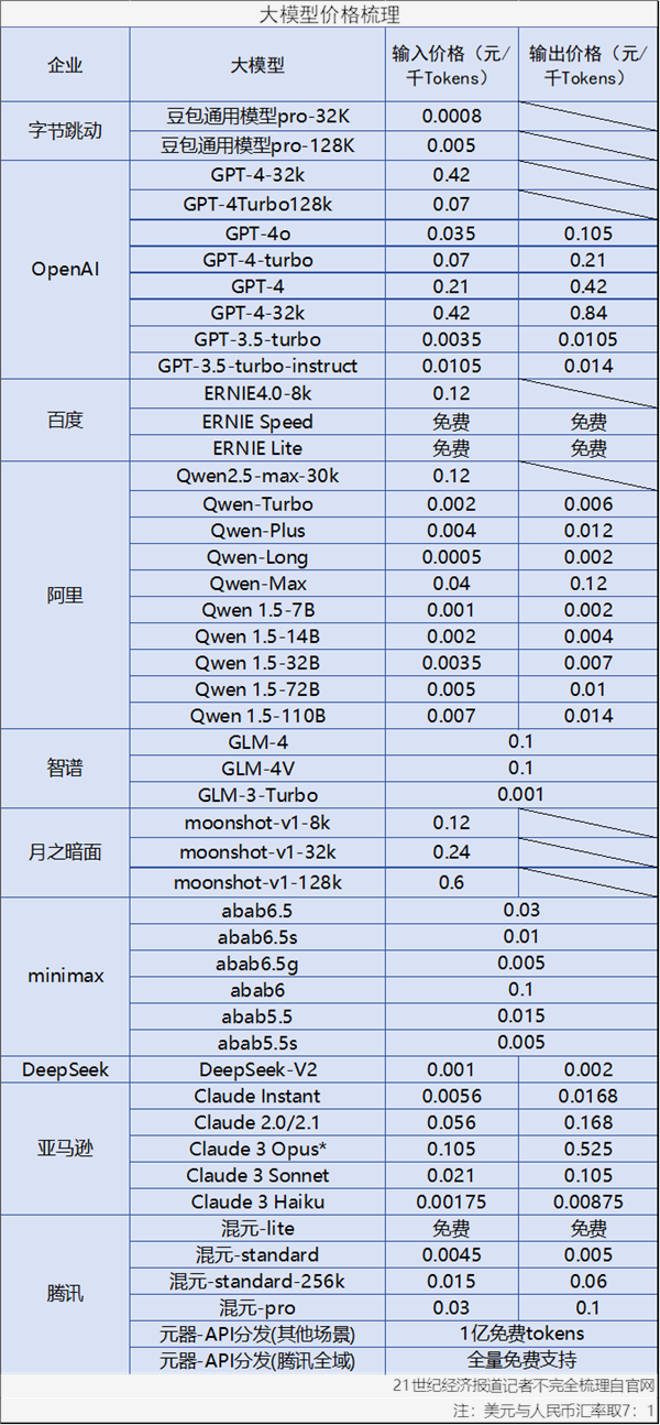 (图说:各大厂商接入相关服务价格。21世纪经济报道记者不完全梳理自公开资料)