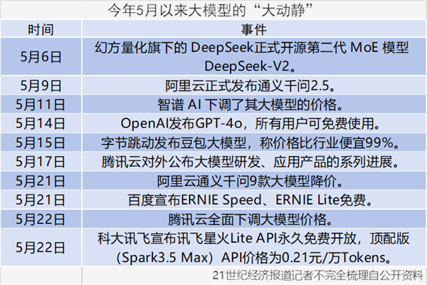 5月6日,幻方量化旗下的DeepSeek正式开源第二代MoE模型:DeepSeek-V2,其定价仅为GPT4-Turbo的1%;5月9日,阿里云发布通义千问2.5,称个人用户可从APP、官网和小程序免费使用相关服务;5月13日,OpenAI发布GPT-4o,表示面向ChatGPT的所有付费和免费用户发布,API价格还比GPT-4Turbo降价50%。