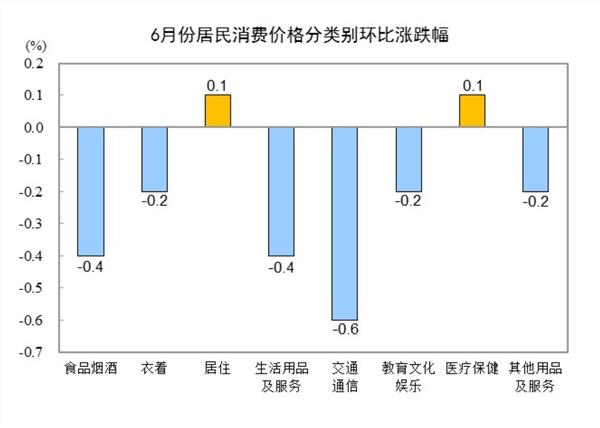 6月份,全国居民消费价格环比下降0.2%。其中,城市下降0.2%,农村下降0.2%;食品价格下降0.6%,非食品价格下降0.2%;消费品价格下降0.4%,服务价格持平。
