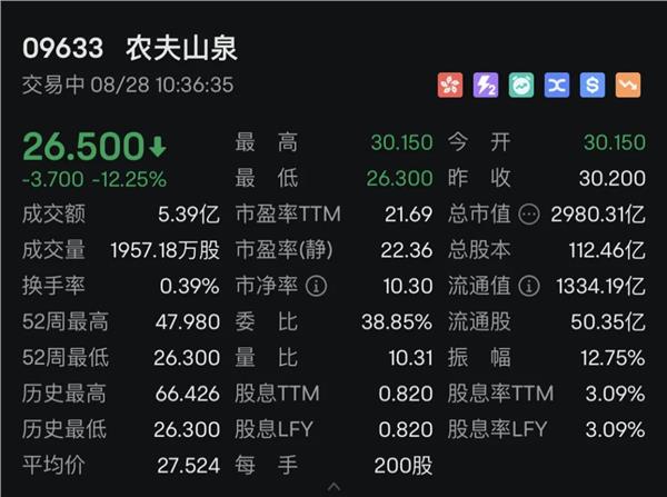 个股方面,农夫山泉(09633.HK)跌超12%。