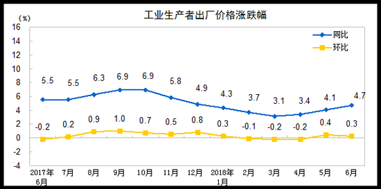 2018年6月份,全国工业生产者出厂价格同比上涨4.7%,环比上涨0.3%。工业生产者购进价格同比上涨5.1%,环比上涨0.4%。上半年,工业生产者出厂价格比去年同期上涨3.9%,工业生产者购进价格上涨4.4%。