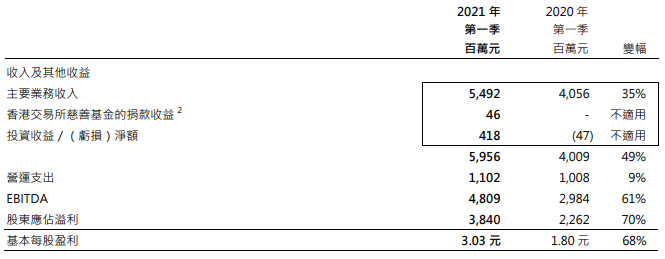 投资收益4.18亿港元,扭转了2020年第一季度的亏损。港交所收入及其他收益总额达59.56亿港元,同比升49%,创季度新高。