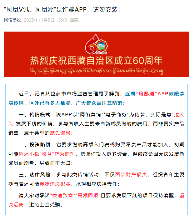 近日,记者从拉萨市市场监督管理局了解到,近期“凤凰潮”APP被曝涉嫌传销,区外已有多人被骗,广大群众需注意防范:一、传销模式:该APP以“网络营销”“电子商务”为伪装,实际是靠“拉人头”发展下线的传销。参与者收入主要来自新成员缴纳的费用,而非真实产品销售,属于典型的庞氏骗局;二、投资陷阱:它要求缴纳高额入门费或购买昂贵产品才能加入。初期可能返还小额“收益”作为诱饵,诱骗你投入更多资金,但最终会因无法发展新成员而崩盘,导致血本无归;三、法律风险:参与此类传销活动,不仅面临财产损失,组织者和主要参与者还可能涉嫌违法犯罪,承担相应法律责任;请大家对承诺“快速致富”“高额回报”且要求发展下线的项目保持清醒,坚决远离,避免上当受骗。