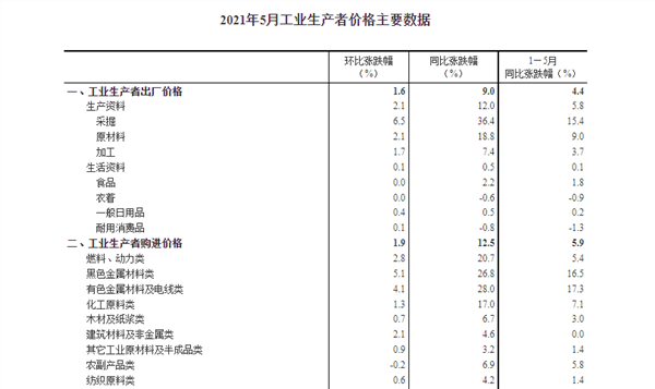 对此,国家统计局城市司高级统计师董莉娟解读称,5月国际原油、铁矿石、有色金属等大宗商品价格大幅上涨,国内需求稳定恢复,我国工业品价格继续上涨。