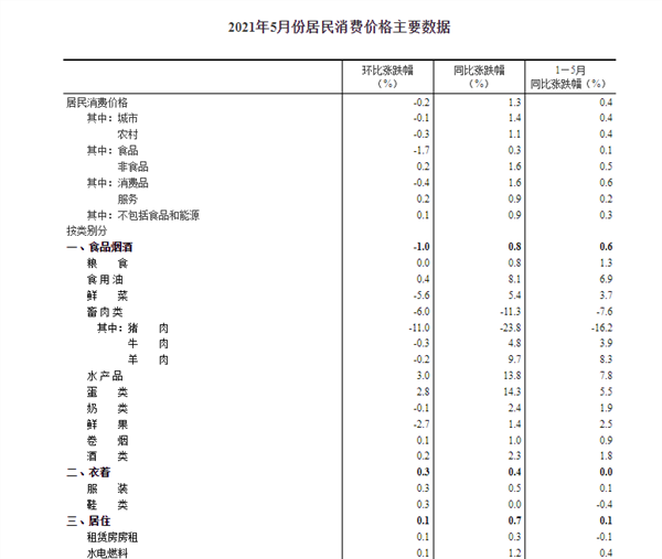 5月份,CPI同比上涨1.3%。其中,城市上涨1.4%,农村上涨1.1%;食品价格上涨0.3%,非食品价格上涨1.6%;消费品价格上涨1.6%,服务价格上涨0.9%。