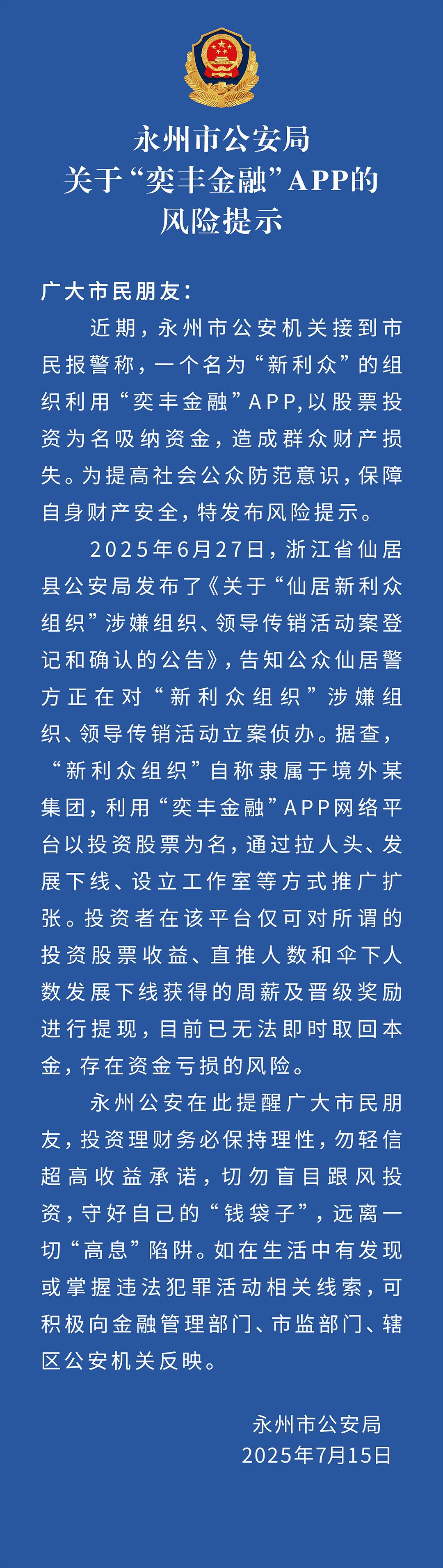 转载请标注:信息网——永州公安:关于“奕丰金融”APP的风险提示