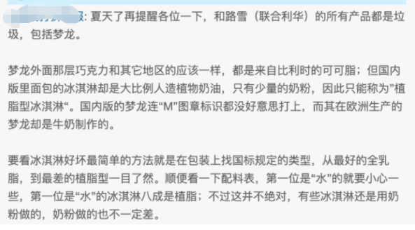 转载请标注:信息网——梦龙雪糕中外用料不一?网友:我不配用牛奶吗?