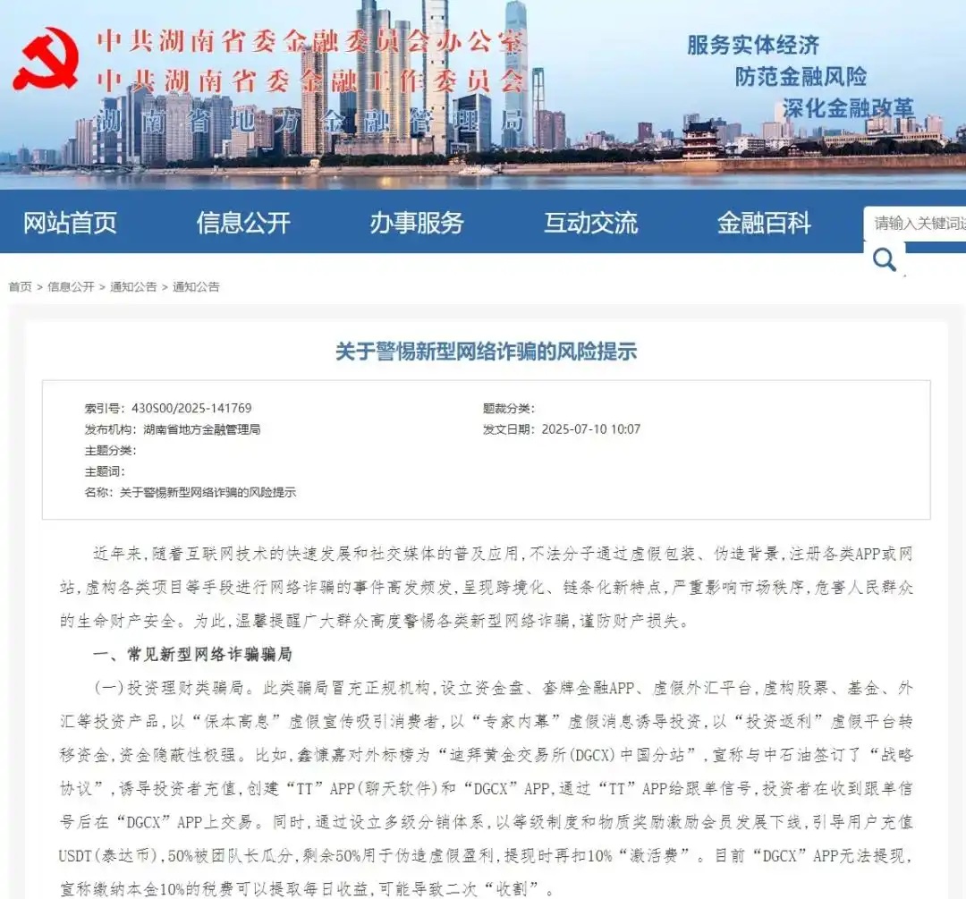 7月10日,湖南省地方金融管理局也提示警惕新型网络诈骗的风险,其表示,不法分子通过虚假包装、伪造背景,注册各类APP或网站,虚构各类项目等手段进行网络诈骗的事件高发频发,呈现跨境化、链条化新特点,严重影响市场秩序,危害人民群众的生命财产安全。