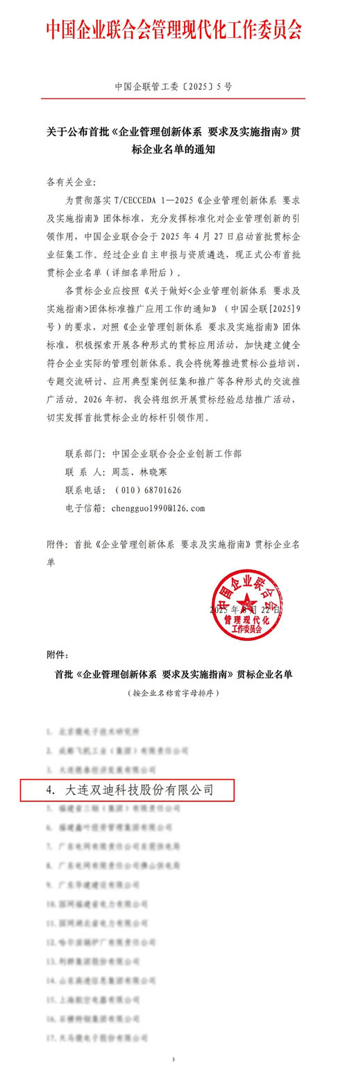 近日,中国企业联合会管理现代化工作委员会正式公布首批《企业管理创新体系 要求及实施指南》贯标企业名单,大连双迪科技股份有限公司(简称“双迪股份”)凭借在企业管理创新领域的深耕实践与突出成果荣耀上榜。值得一提的是,此次上榜的企业除了各优秀民营企业外还有十多家“中字头”国企,更彰显了榜单的权威性。