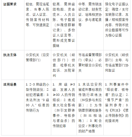 1.《禁止传销条例》的调查取证(如财务凭证、场地协议)可作为《治安管理处罚法》《刑法》的基础证据;