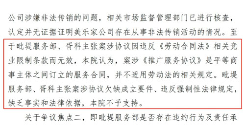 从一审判决结果来看,法院支持了双方服务协议的合法有效性,没有支持被告对原告涉传的指控,没有支持原告要求被告赔偿因违反竞业条款造成的损失,仅支持了被告酌情赔偿违约期间收到服务费的一半。该案详情请参见本站文章《美乐家服务协议暗藏竞业条款 直销商跳槽要赔偿?》。