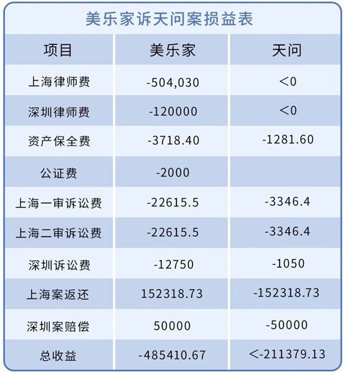 综上所述,我们得出了美乐家两诉天问案的双方得失,结果是美乐家亏了485410.67元,天问至少亏了211379.13元,这场博弈中唯一的赢家是双方律师,或许还有在这两个公司之外的看客。