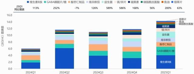 情绪管理营养品市场正经历爆发式增长,2024-2025年线上销售额达5.4亿元,同比增长38%。其中维生素B族以1.9亿元销售额(占比35.2%)领跑,GABA睡眠片和酸枣仁制品分别占14.5%和13.4%,形成多元发展格局。