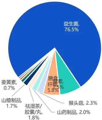 肠道健康市场以46.1亿元销售额成为保健食品第二大品类,其中益生菌以36.7亿元(占比76.5%)占据绝对主导地位。万
