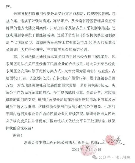 我是湖南炎帝生物工程有限公司法人、董事长、总裁王永良,现就昆明市公安局东川区分局在无管辖权的情况下强行管辖,违规跨区“逐利性”立案执法一事向政府反映。自2023年12月9日我被羁押至今已长达9个月的时间,现本案已被东川区人民检察院移送到东川区人民法院审理,我恳请株洲市人民政府按照党中央保护企业家的文件精神和政策对案件高度重视,依法督促东川区人民法院对案件公正处理,使该案回到正常的轨道上。