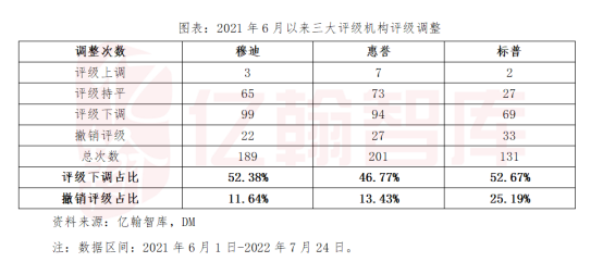 (2)下调为主流:在三大机构的评级调整动作中,评级下调和评级撤销占比在六到七成。