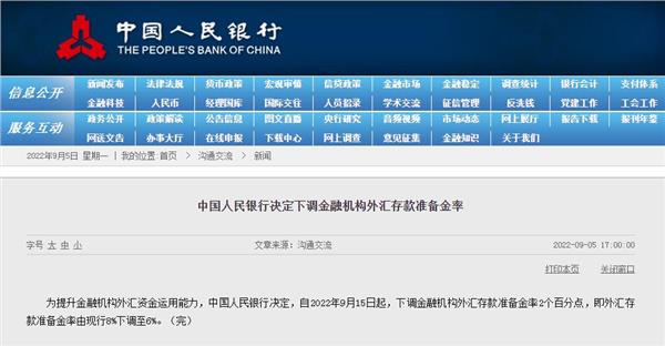 这是央行今年第二次下调外汇存款准备金率。今年4月25日,央行发布公告称,自2022年5月15日起,下调金融机构外汇存款准备金率1个百分点,即外汇存款准备金率由现行的9%下调至8%。