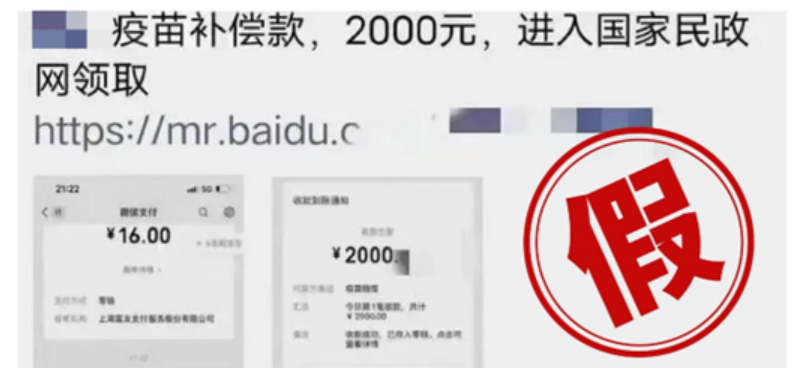 这则传言起因,有网帖称“接种新冠疫苗可在国家民政网站领取补偿”,并附网址链接和收款通知,以此诱导人们关注转发的谣言。