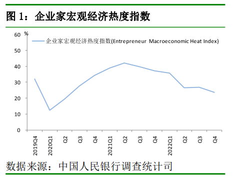 2022年第四季度中国人民银行企业家问卷调查结果显示,企业家宏观经济热度指数为23.5%,比上季下降3.4个百分点,比上年同期下降13.7个百分点。其中,53.7%的企业家认为宏观经济“偏冷”,45.5%认为“正常”,0.8%认为“偏热”。