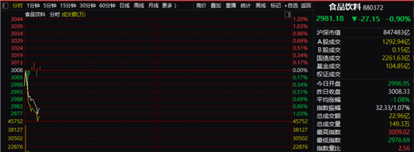 那么,此次重磅发文是否会对这个板块构成冲击呢?从周一开盘的情况来看,白酒板块受到的冲击相对较大,整个食品饮料开盘弱于大盘。食品饮料指数开盘后不久就跳水。